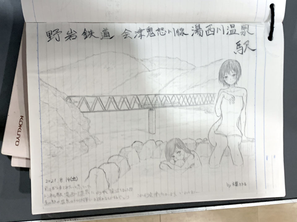 「温泉駅」の駅ノートは、いわゆる「肌色多め」イラストを描かれる方が多いです。
